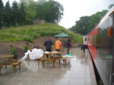 The scene at about 11.30 - heavy rain and the beginnings of the big gazebo.